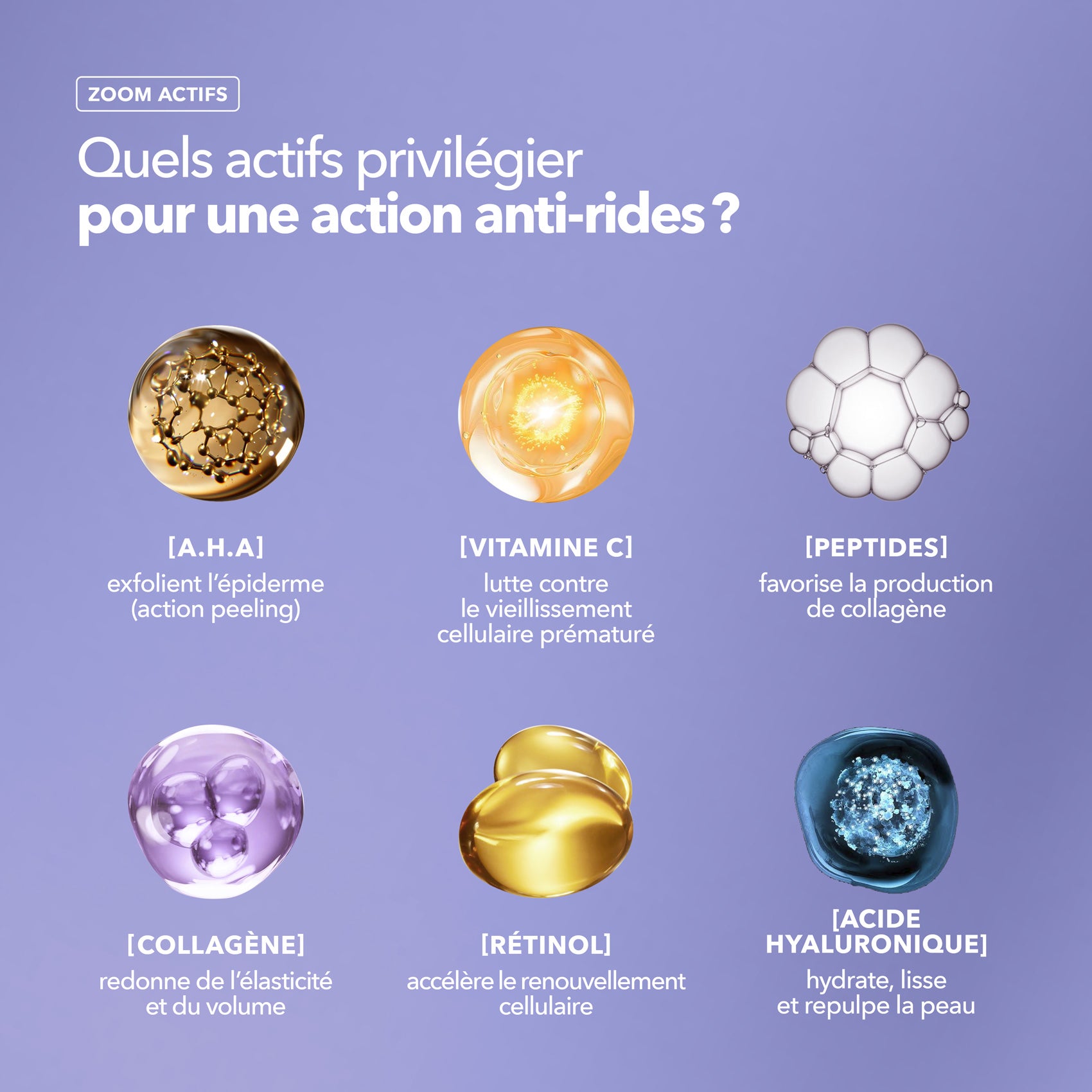 Avec l’âge, le teint peut devenir moins lumineux et les rides s'installer. Cependant, certaines peaux ont tendance à marquer plus vite, notamment si elles manquent d'eau et de lipides. Privilégiez une routine cosmétique saine et enrichie en actifs lissants comme l'acide hyaluronique, molécule star de l'anti-âge pour sa capacité à retenir jusqu'à 1000 fois son poids en eau dans la peau. Il convient également d'appliquer une protection solaire pour toute exposition aux UV, 80% du vieillissement de la peau étant lié au soleil !