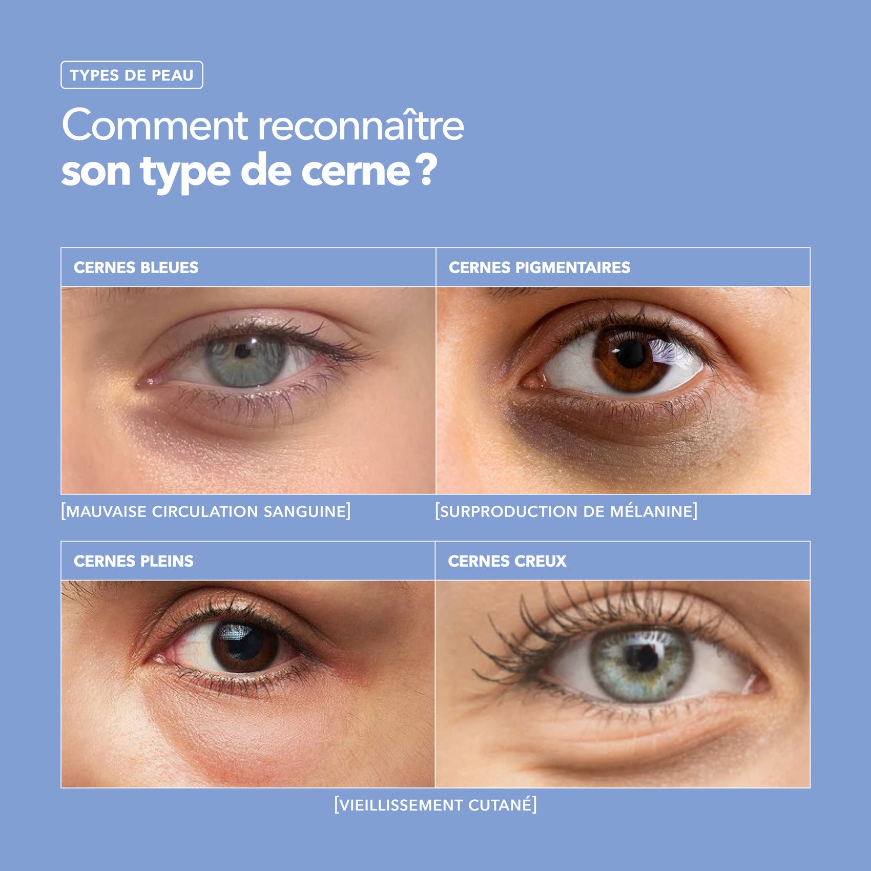 Ils trahissent parfois notre fatigue et peuvent alourdir notre regard : les cernes et les poches nous mènent la vie dure ! Bleutés, pigmentaires ou creux, savez-vous reconnaître votre type de cernes ?